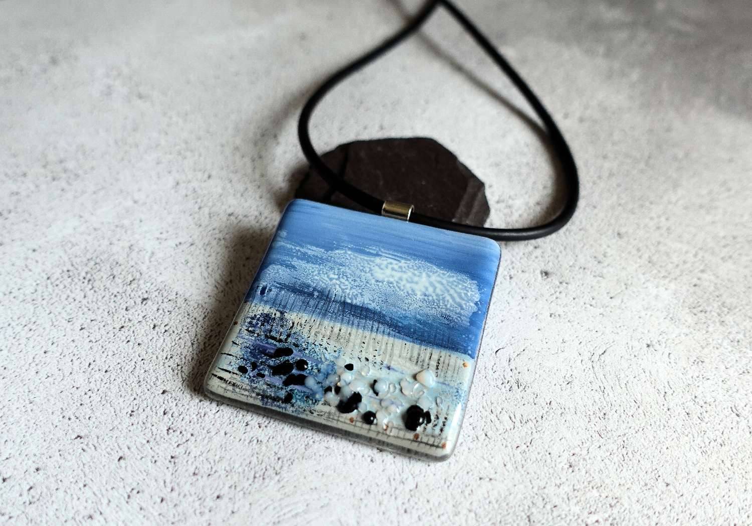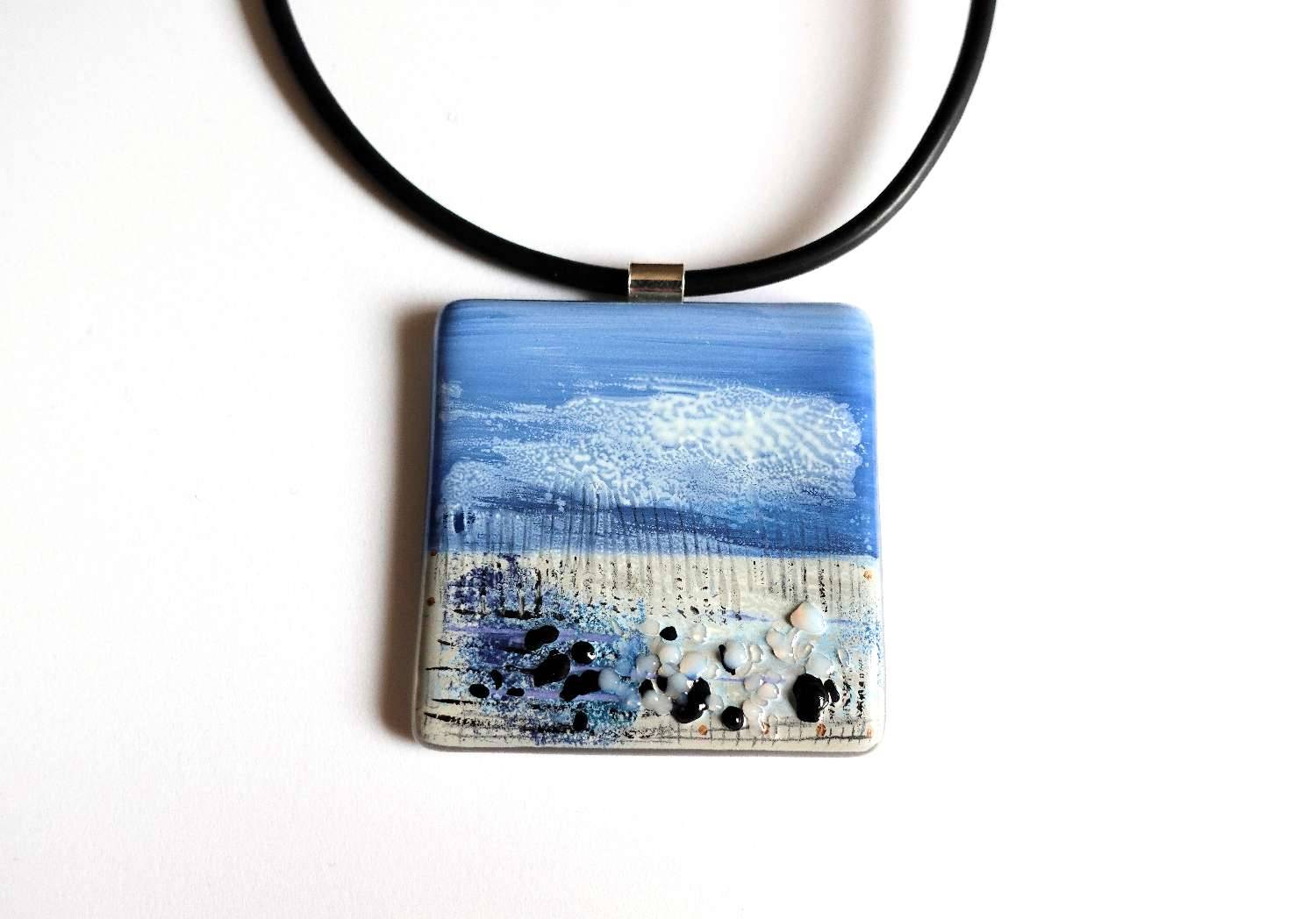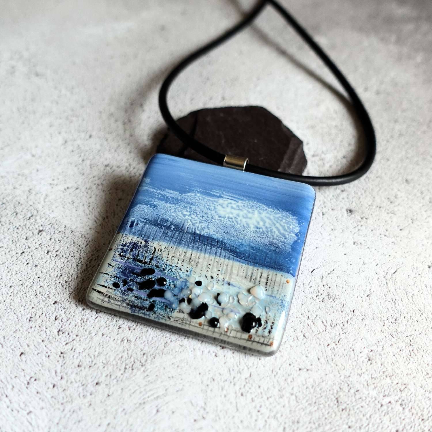 A painted landscape of a fenland in spring. A soft sky yields streaky clouds and textured rocks appear at the base as a raised tactile scene. Hand painted by Jenny using glass enamels which are then bonded to the glass base in a kiln.