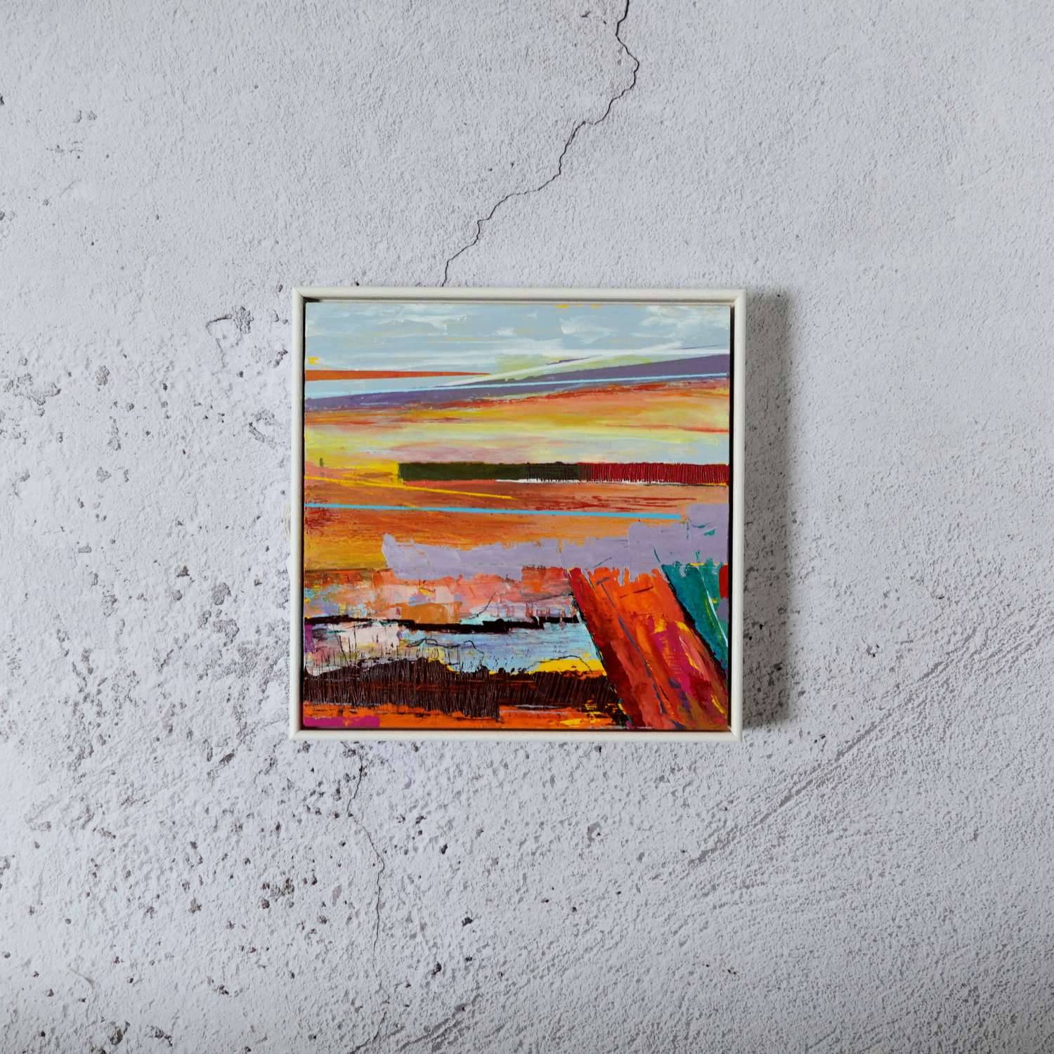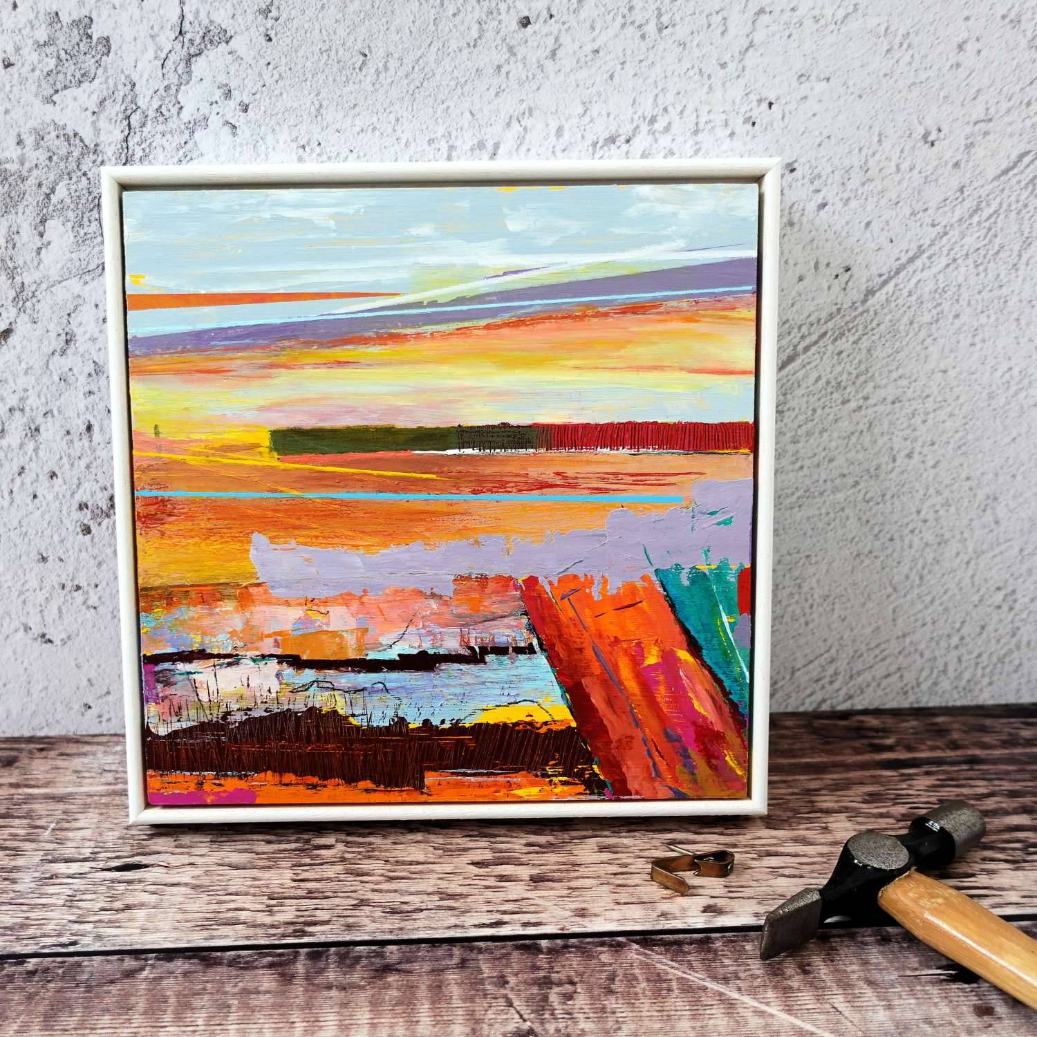 Original abstract painting by Jenny. Ready to hang. As Summer Comes - A modern square shape in a white wooden frame. Great for a small cosy space, in a sunny spot, with a cup of warm coffee. The painting is a landscape stretching to a distant horizon with a setting summer sun with lots of warm, bright sunny colours.