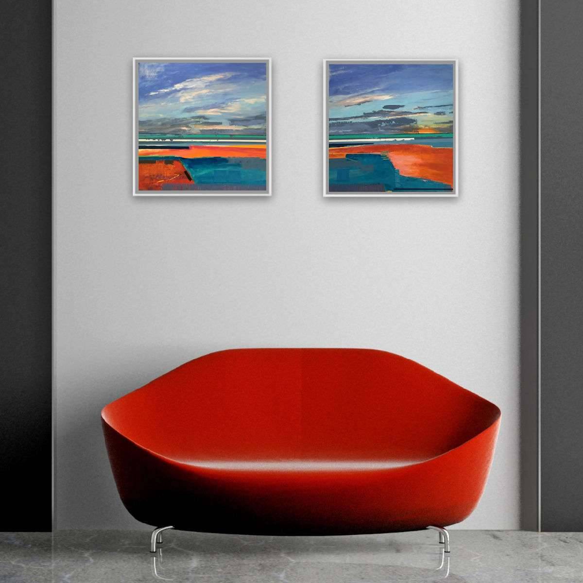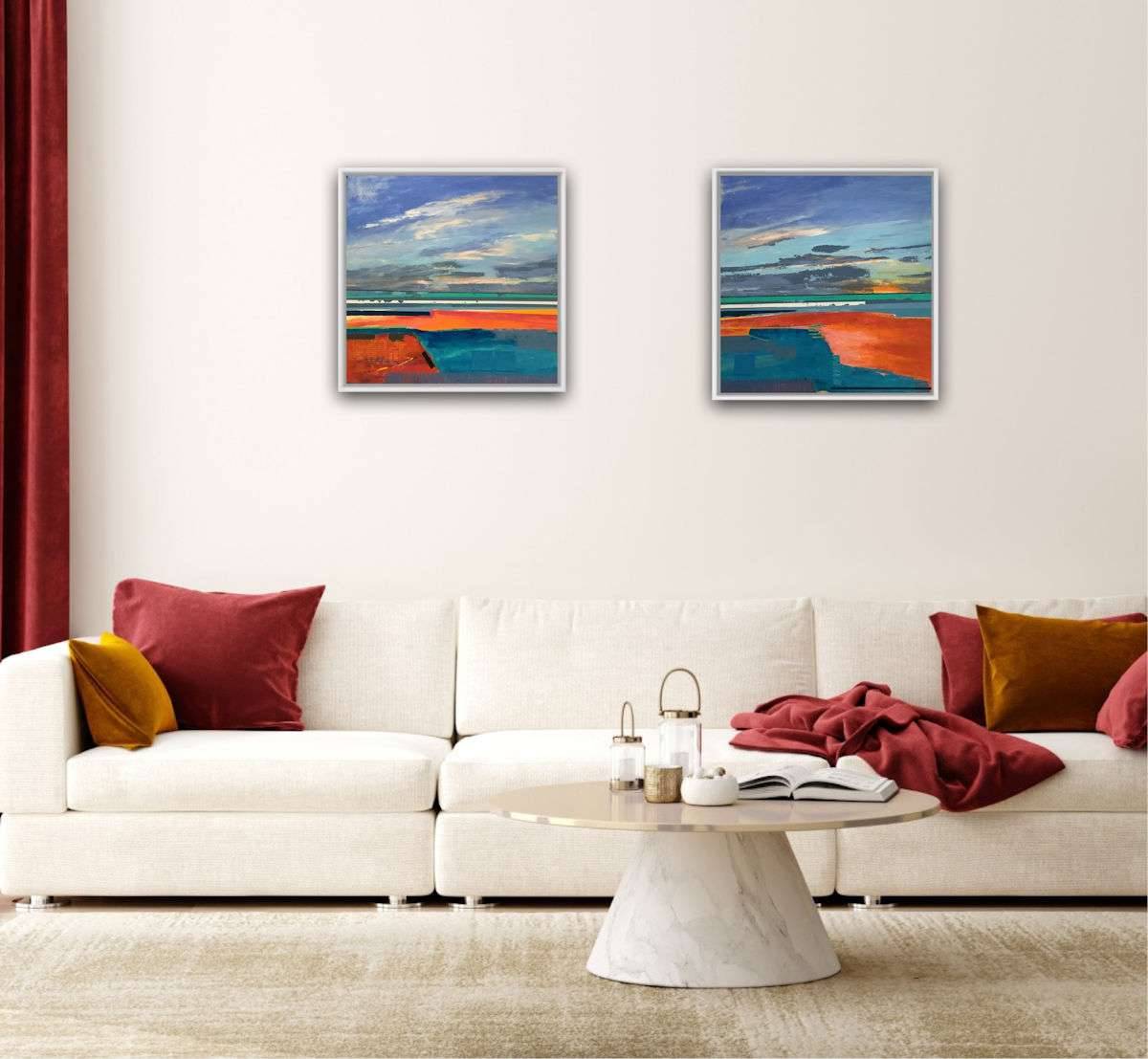 Approaching Evening - Original abstract painting by Jenny. Ready to hang. A contemporary square shape 40 x 40cm in a white wooden frame