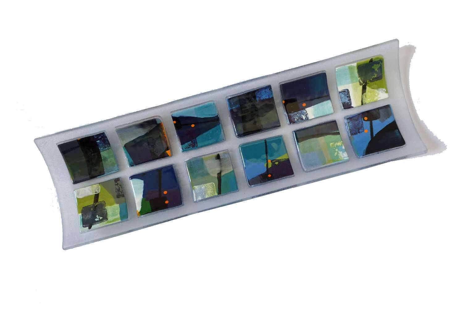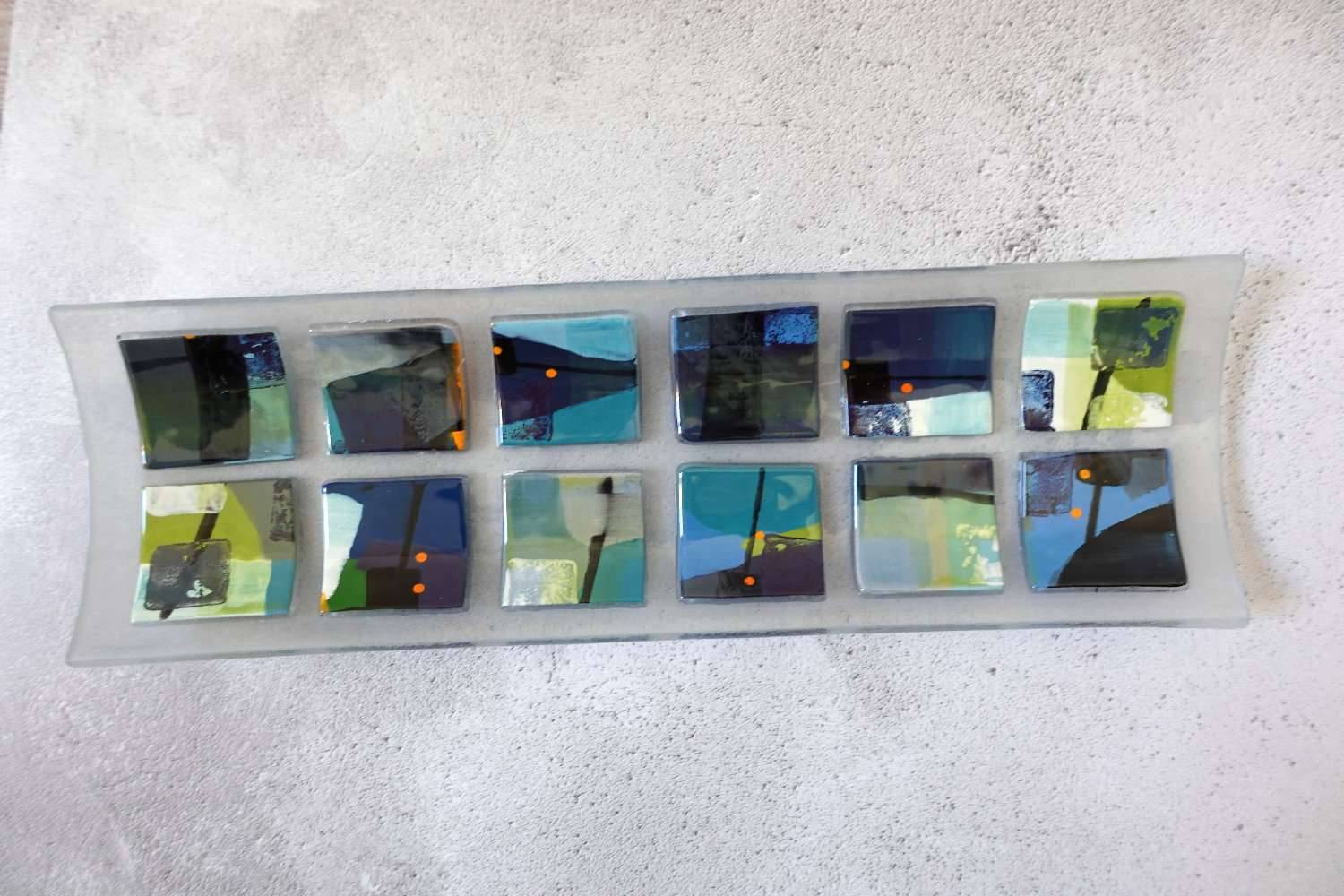 A bright centre piece for any table. Made from fused glass and enamel in a palette of blues and colours evoking a harbour drenched in evening shade and the pop of lighted boats on the water
