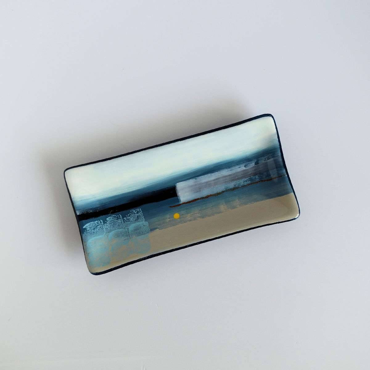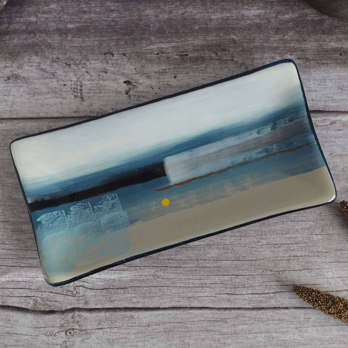 A contemporary piece of table art for a modern home. Made by Jenny in fused and enamelled glass, bonded together in the kiln to make a versatile platter for functional use or as a show piece on a side or dining table