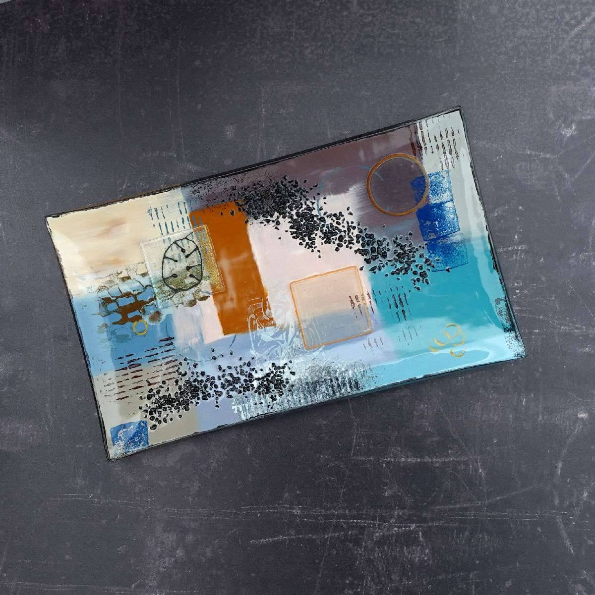 Hand painted with enamels and bonded to the glass in the kiln. This contemporary fused glass platter makes a stylish centre piece on any table. Raised glass sections decorated with hand drawn seed heads and a sprinkling of crushed glass. Made using art glass in earthy colours for warm feel.