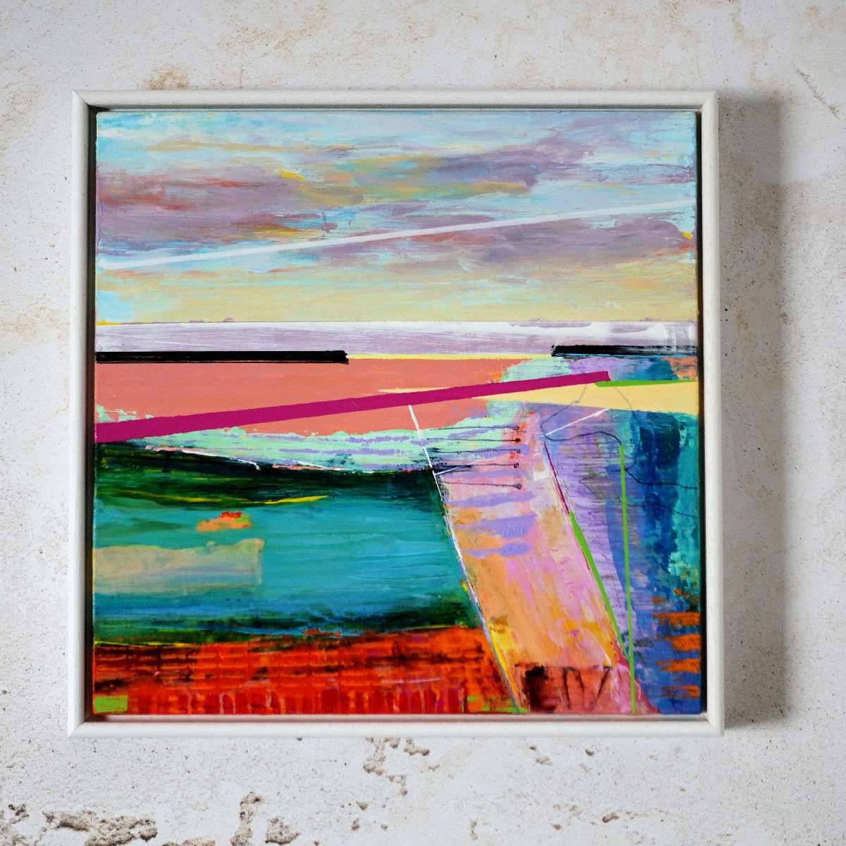 Original landscape painting by Jenny. Ready to hang. Casting Shadows - A warm landscape exploring shadows connecting in the half light of the day, patterning the landscape with interesting shapes falling on watery spaces and soft light. A modern square shape in a white wooden frame. Great for a small cosy space, curled up, with a good book