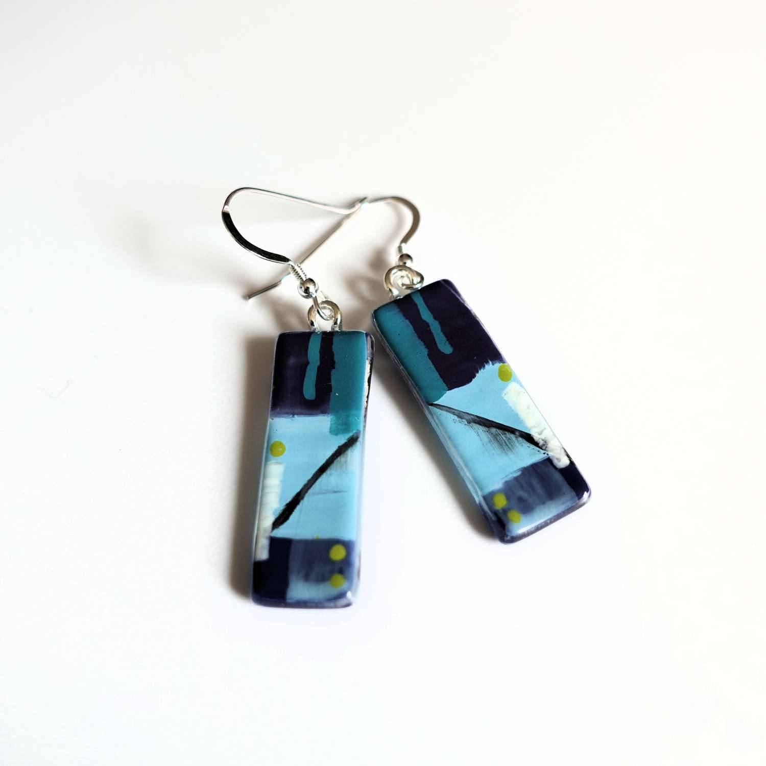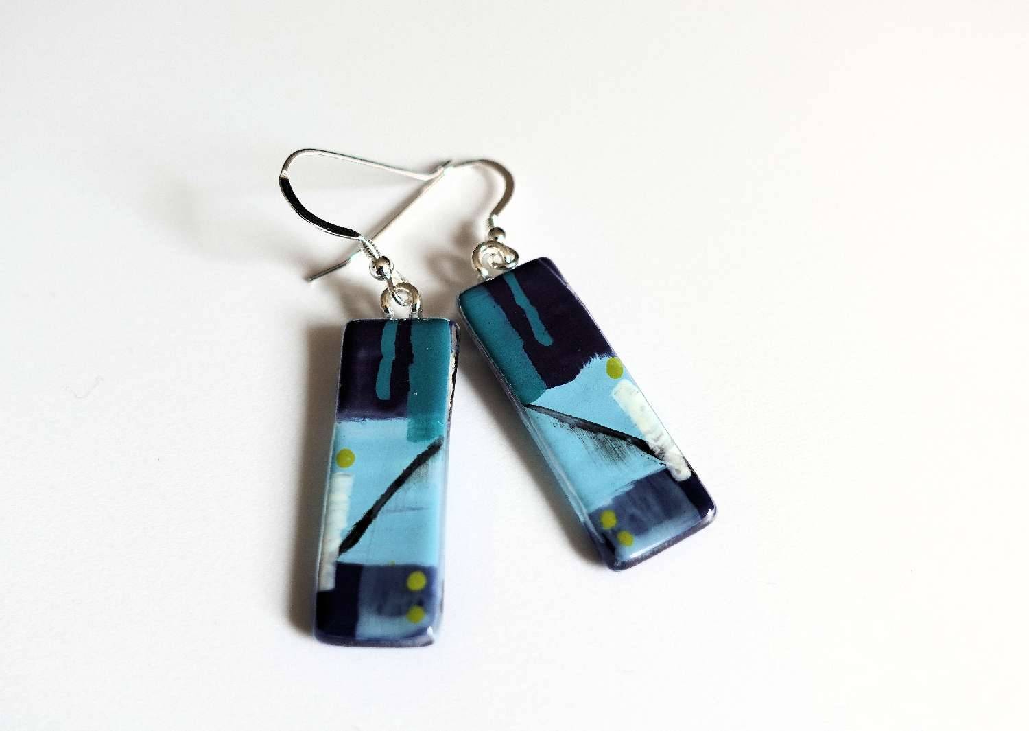 Fused glass and enamel earrings. 'Reflections' - layers of glass are hand painted and mono printed before firing in the kiln to bond with the glass. These earrings are glossy and bright with a smooth glass surface