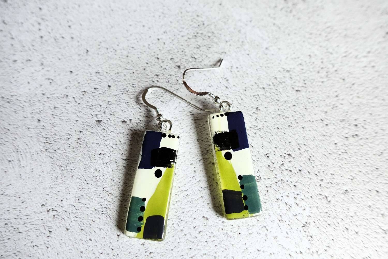 Hand painted in enamels by Jenny and heated in the kiln to bond with the base glass. Lightweight and individual. Each pair of earrings is contemporary and unique.