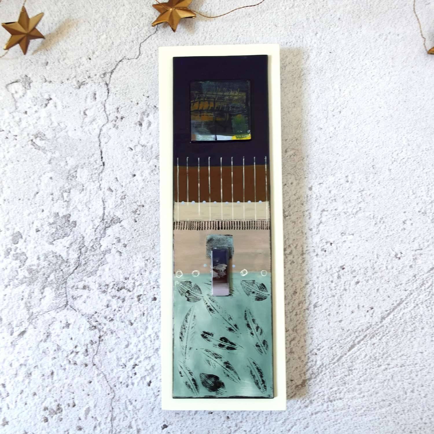 French Leaf Wall Panel - based on a palette from the French countryside this fused glass panel is hand painted by Jenny to show ridges and footpaths with a suggestion of ancient woodland. The mono prints are taken from collected garden leaves. Signed JH
